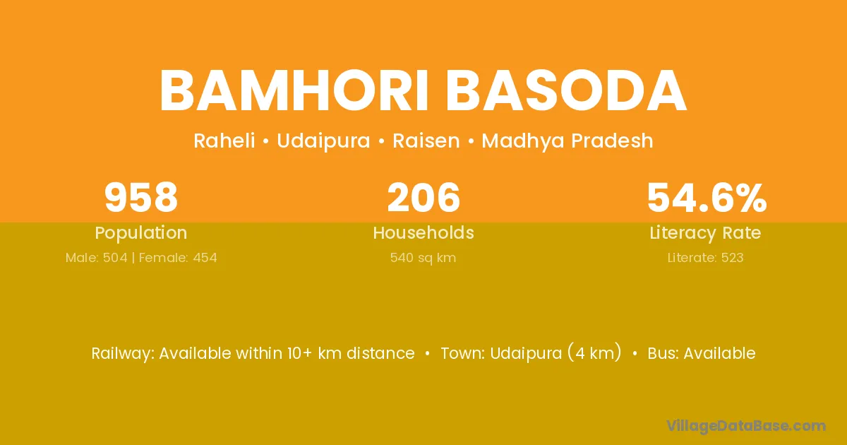 Bamhori Basoda village has a total population of 958 people, of which 504 are males and 454 are females.