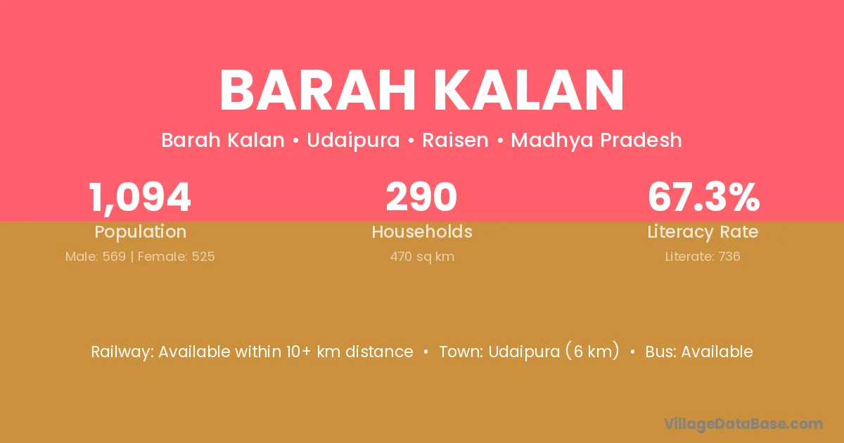 Udaipura (6 km) is the nearest town to Barah Kalan village for major economic activities and is located approximately 6 km away.