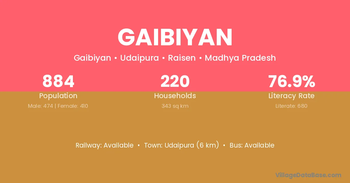 Udaipura (6 km) is the nearest town to Gaibiyan village for major economic activities and is located approximately 6 km away.