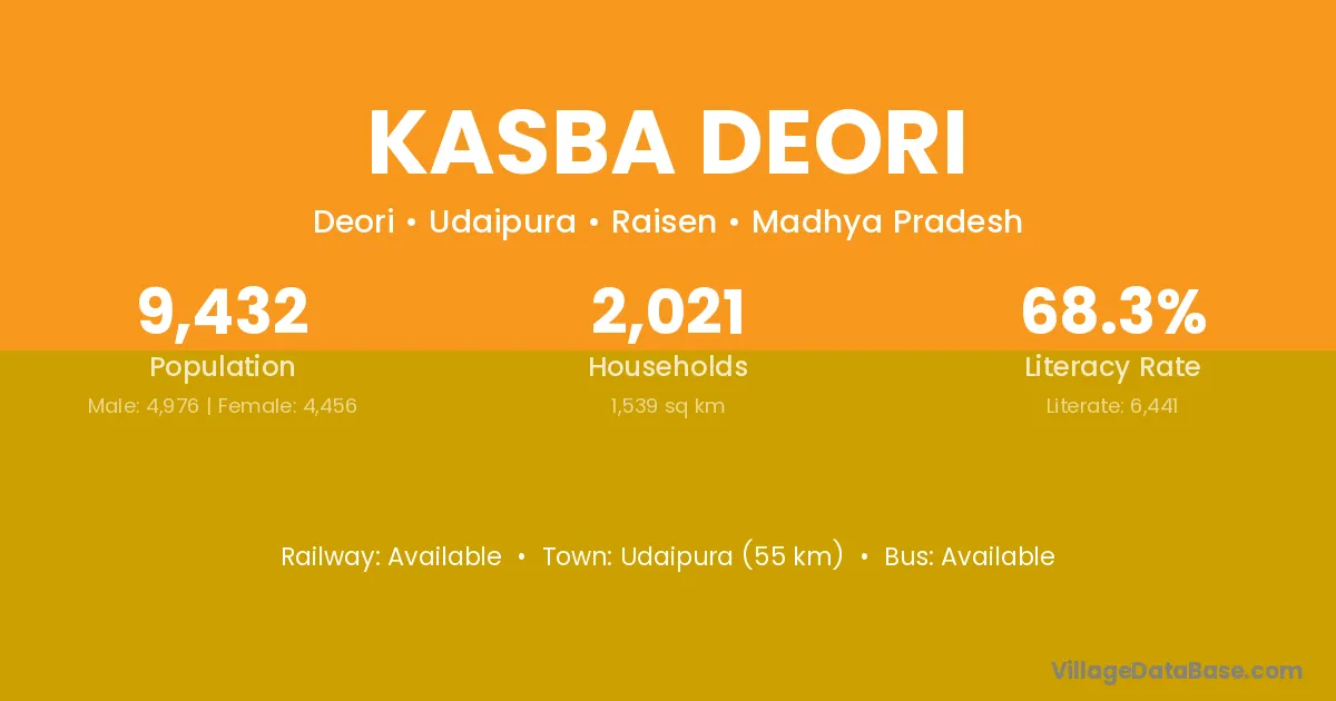 Udaipura (55 km) is the nearest town to Kasba Deori village for major economic activities and is located approximately 55 km away.