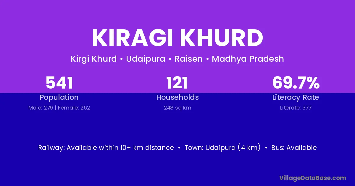 Udaipura (4 km) is the nearest town to Kiragi Khurd village for major economic activities and is located approximately 4 km away.