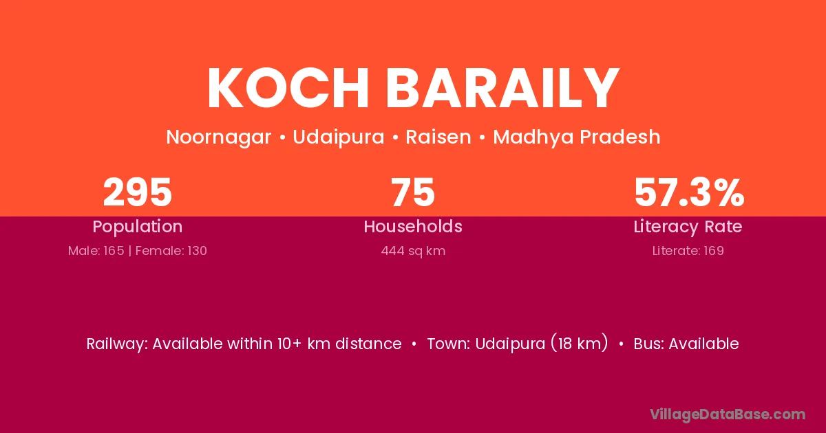 Udaipura (18 km) is the nearest town to Koch Baraily village for major economic activities and is located approximately 18 km away.