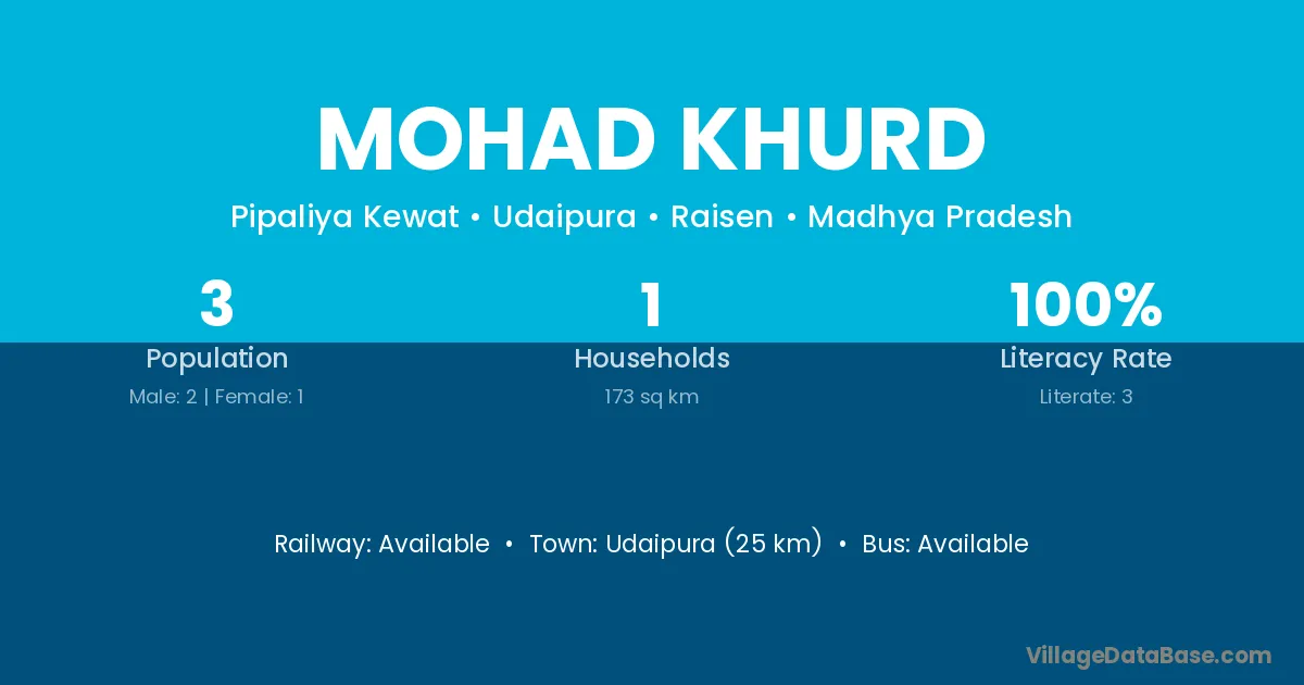 Udaipura (25 km) is the nearest town to Mohad Khurd village for major economic activities and is located approximately 25 km away.