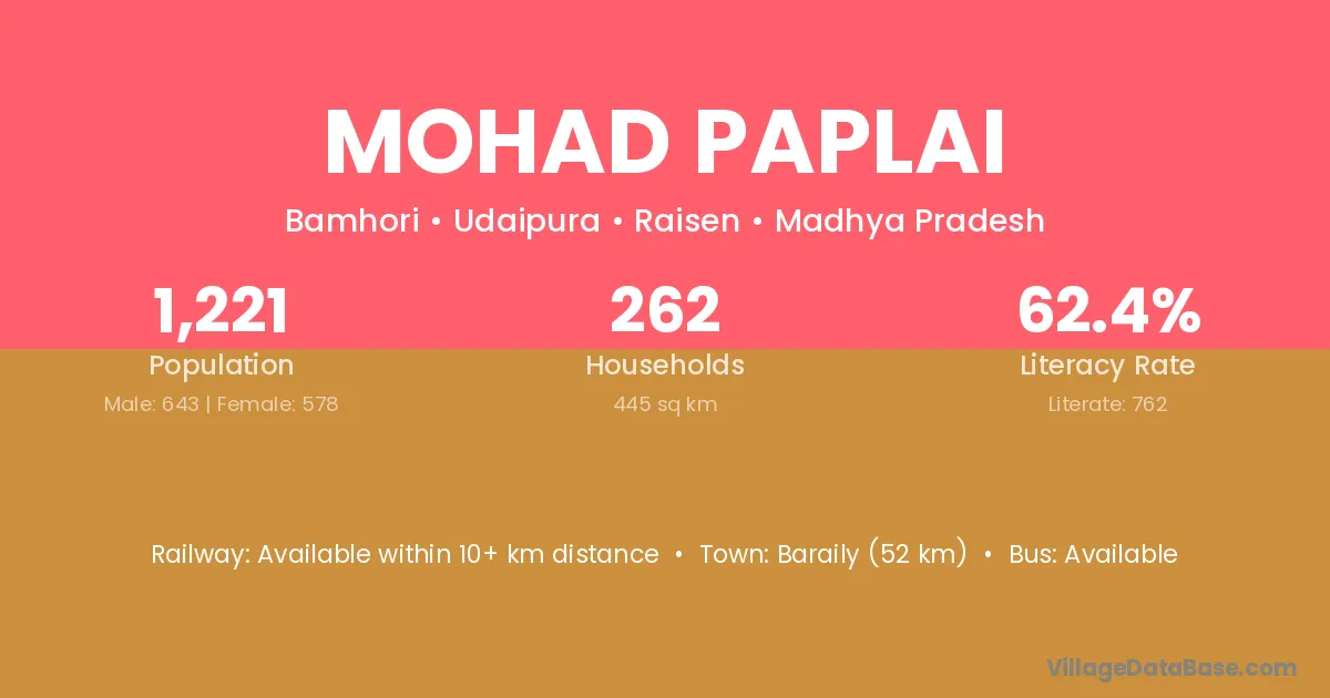 Mohad Paplai village has a total population of 1,221 people, of which 643 are males and 578 are females.