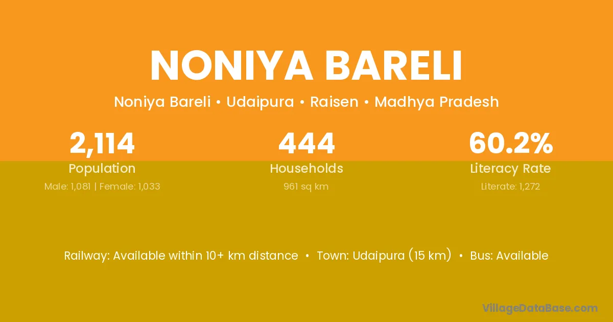Udaipura (15 km) is the nearest town to Noniya Bareli village for major economic activities and is located approximately 15 km away.