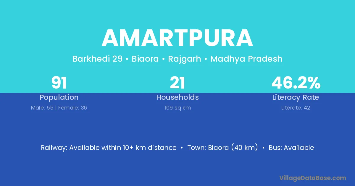 Biaora (40 km) is the nearest town to Amartpura village for major economic activities and is located approximately 40 km away.