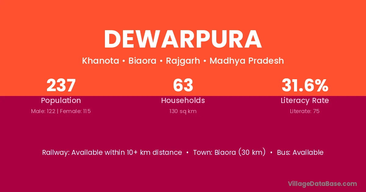 Biaora (30 km) is the nearest town to Dewarpura village for major economic activities and is located approximately 30 km away.