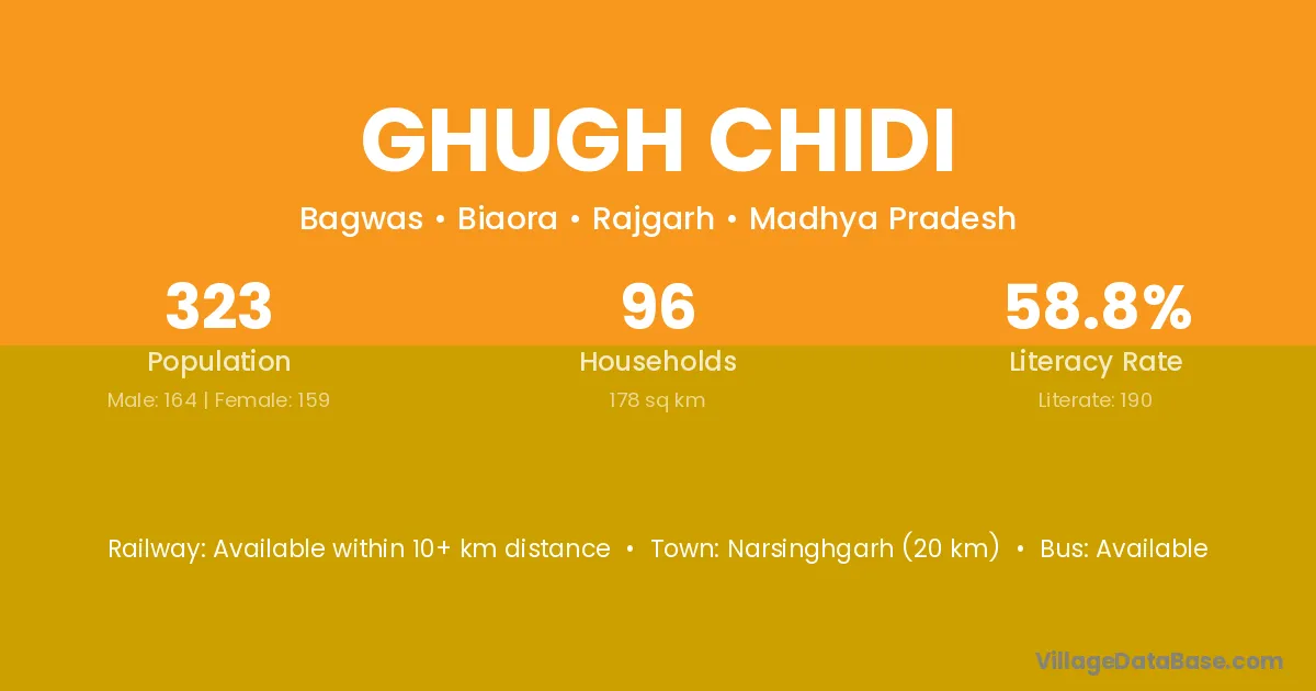 Narsinghgarh (20 km) is the nearest town to Ghugh Chidi village for major economic activities and is located approximately 20 km away.