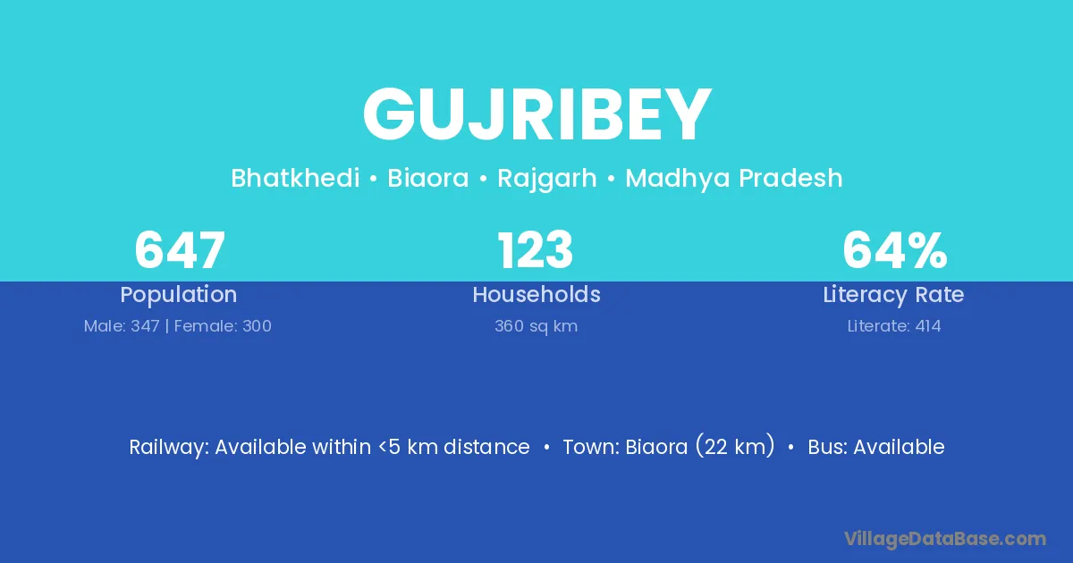 Biaora (22 km) is the nearest town to Gujribey village for major economic activities and is located approximately 22 km away.