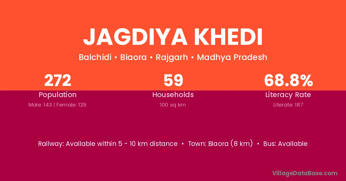 Jagdiya Khedi village has a total population of 272 people, of which 143 are males and 129 are females.
