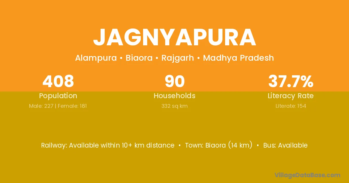 Biaora (14 km) is the nearest town to Jagnyapura village for major economic activities and is located approximately 14 km away.