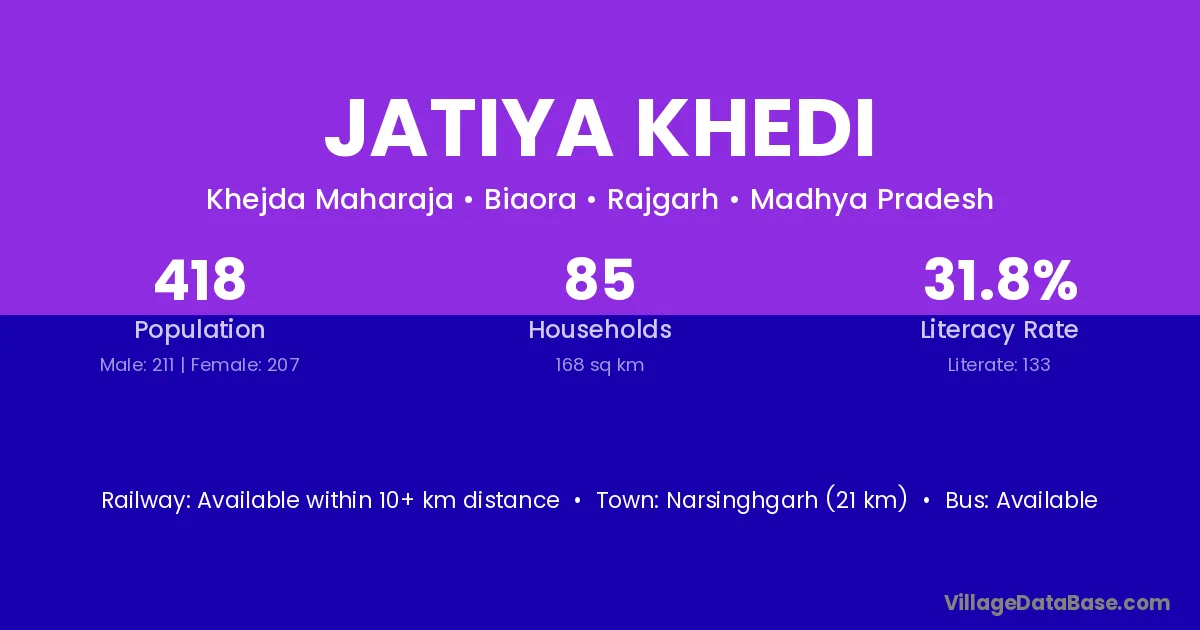Jatiya Khedi village has a total population of 418 people, of which 211 are males and 207 are females.