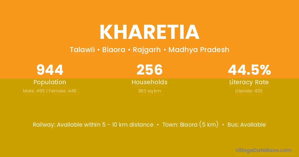 Biaora (5 km) is the nearest town to Kharetia village for major economic activities and is located approximately 5 km away.