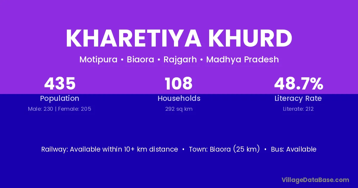 Biaora (25 km) is the nearest town to Kharetiya Khurd village for major economic activities and is located approximately 25 km away.