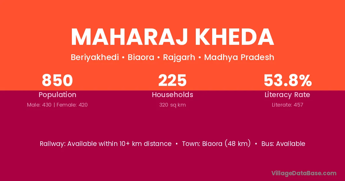 Biaora (48 km) is the nearest town to Maharaj Kheda village for major economic activities and is located approximately 48 km away.