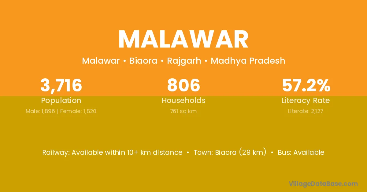 Biaora (29 km) is the nearest town to Malawar village for major economic activities and is located approximately 29 km away.