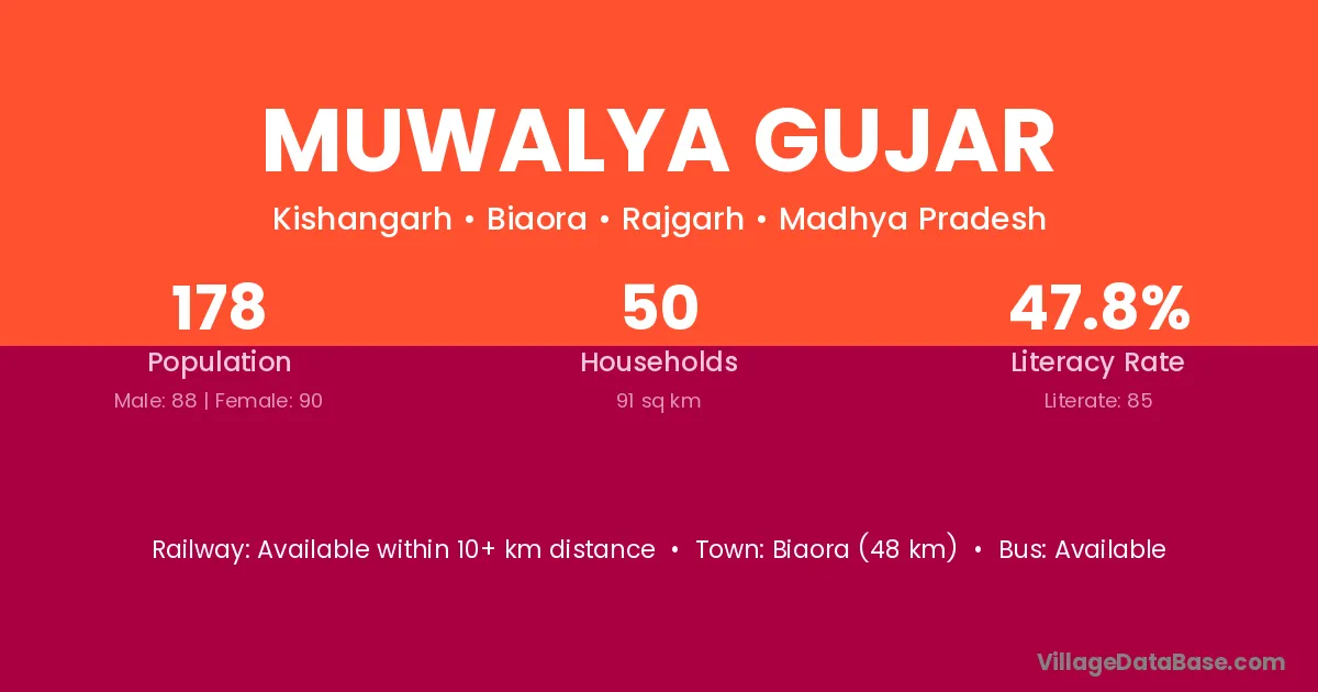 Biaora (48 km) is the nearest town to Muwalya Gujar village for major economic activities and is located approximately 48 km away.
