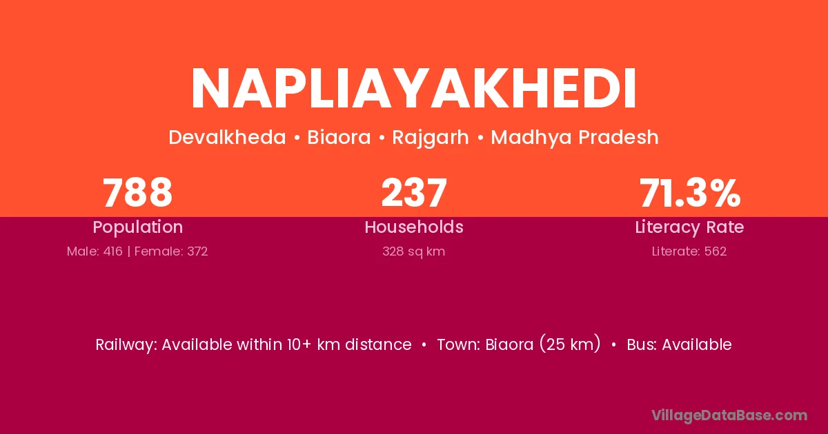 Biaora (25 km) is the nearest town to Napliayakhedi village for major economic activities and is located approximately 25 km away.