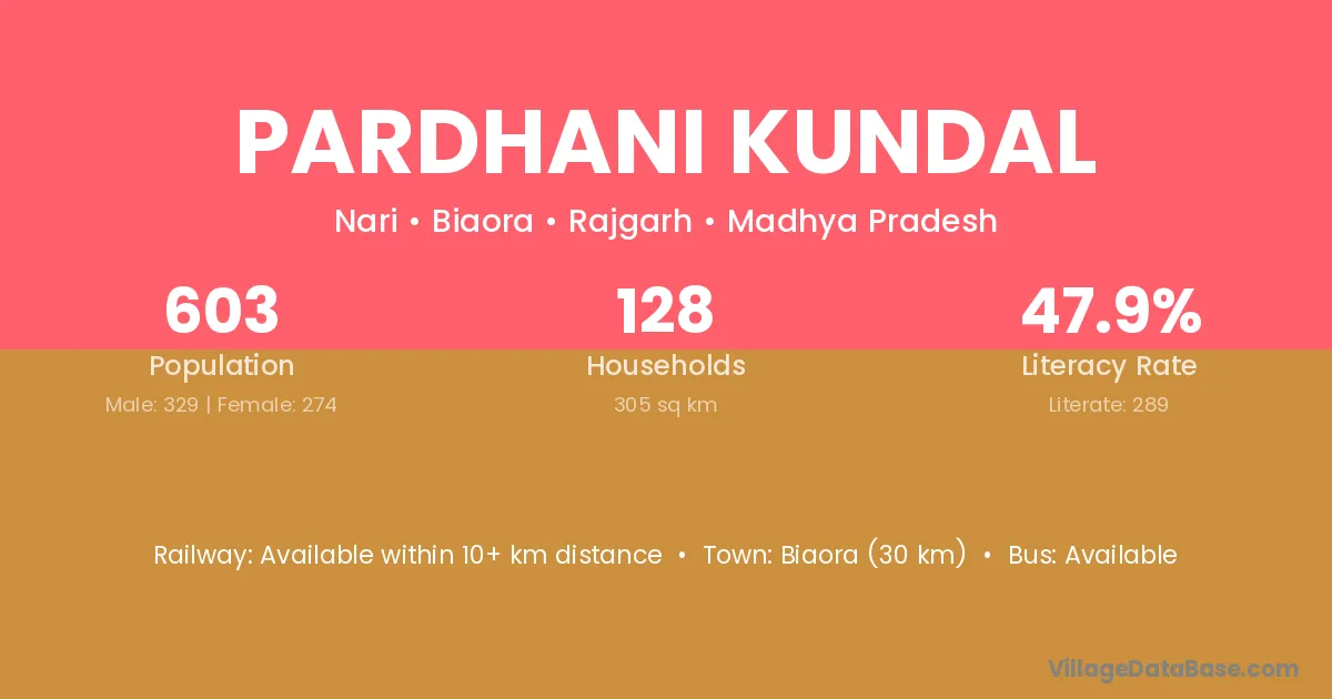 Biaora (30 km) is the nearest town to Pardhani Kundal village for major economic activities and is located approximately 30 km away.