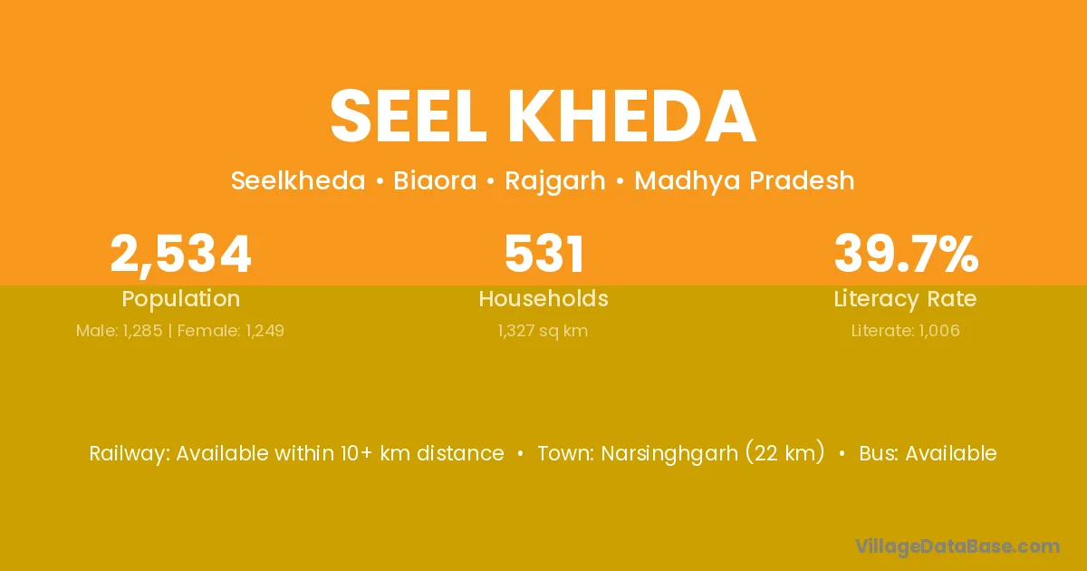 Narsinghgarh (22 km) is the nearest town to Seel Kheda village for major economic activities and is located approximately 22 km away.
