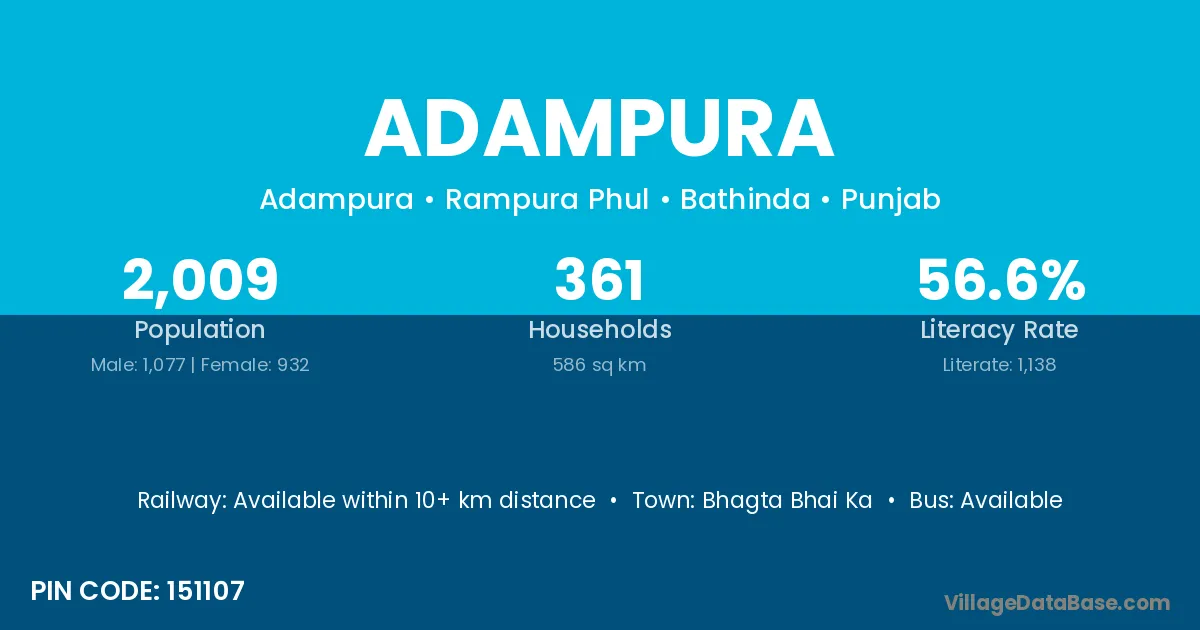 Jirapur (25 km) is the nearest town to Adampura village for major economic activities and is located approximately 25 km away.