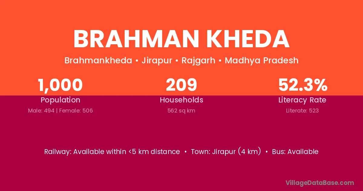 Jirapur (4 km) is the nearest town to Brahman Kheda village for major economic activities and is located approximately 4 km away.