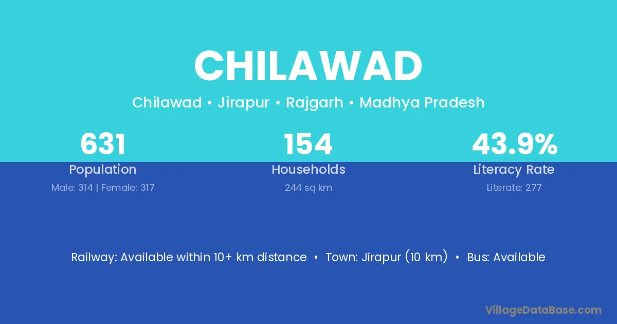 The literacy rate of Chilawad village is 43.90%. Male literacy stands at 49.04% and female literacy at 38.80%.