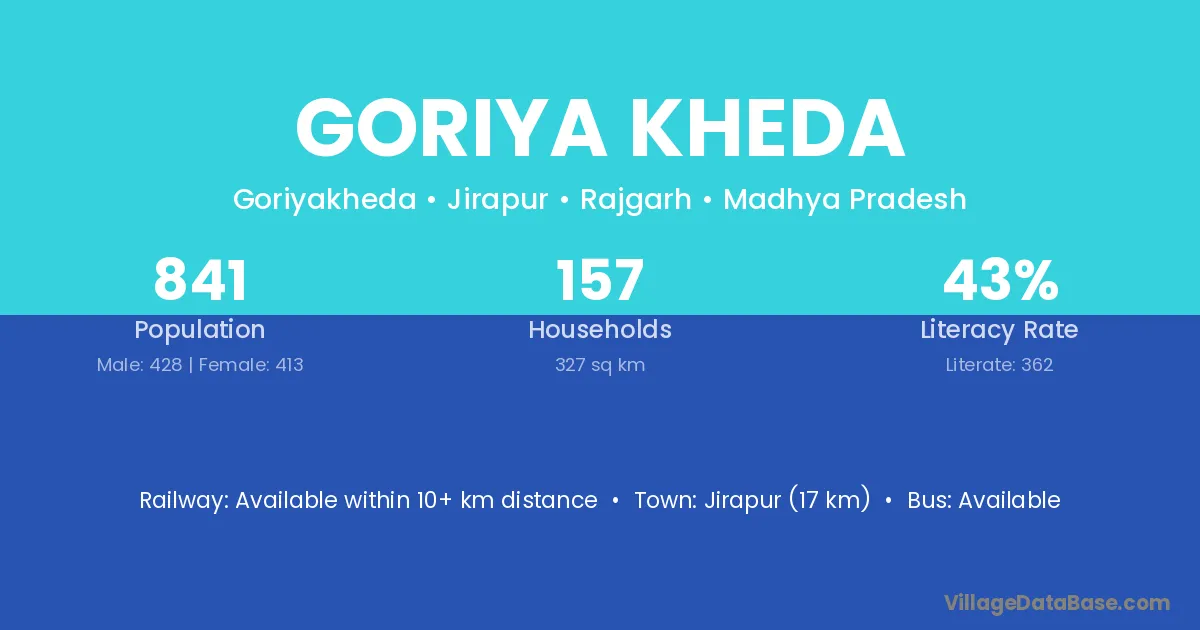 Jirapur (17 km) is the nearest town to Goriya Kheda village for major economic activities and is located approximately 17 km away.