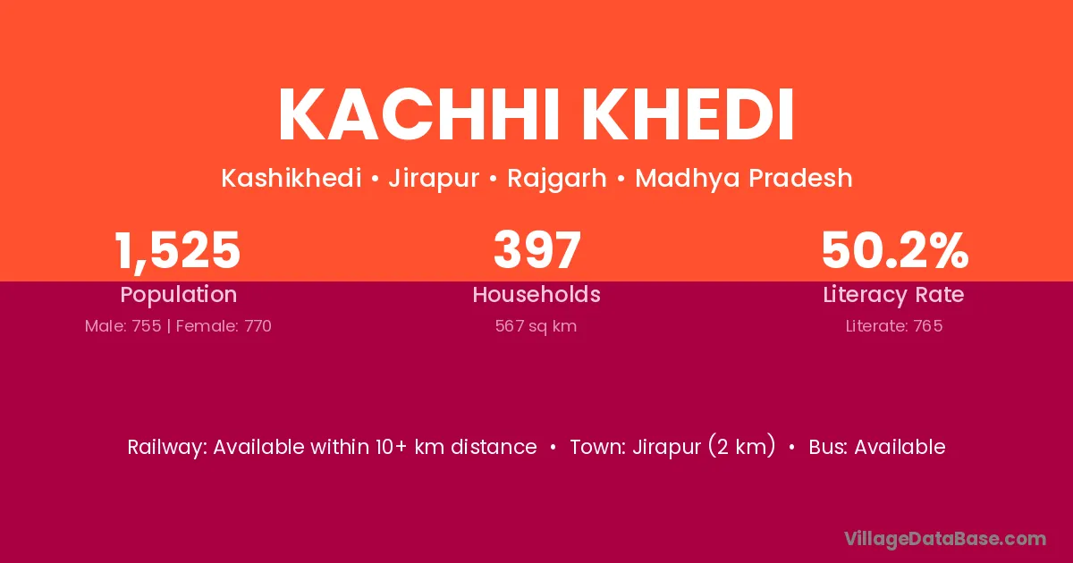 Jirapur (2 km) is the nearest town to Kachhi Khedi village for major economic activities and is located approximately 2 km away.