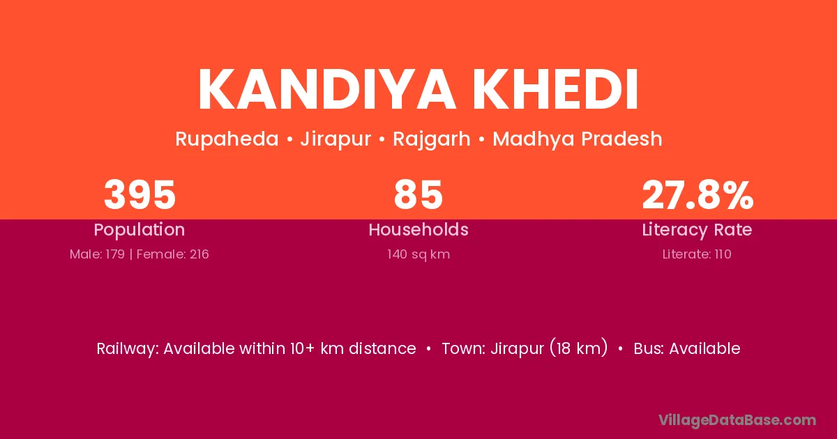 Kandiya Khedi village has a total population of 395 people, of which 179 are males and 216 are females.