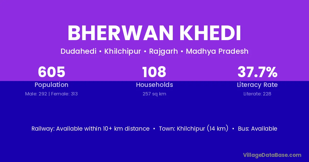 Bherwan Khedi village has a total population of 605 people, of which 292 are males and 313 are females.