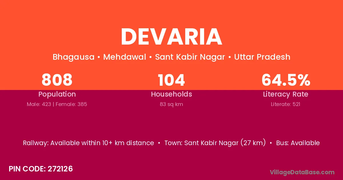 The literacy rate of Devaria village is 51.65%. Male literacy stands at 67.44% and female literacy at 33.63%.