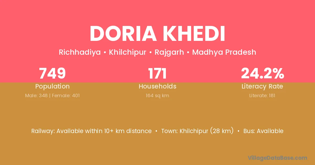 Khilchipur (28 km) is the nearest town to Doria Khedi village for major economic activities and is located approximately 28 km away.
