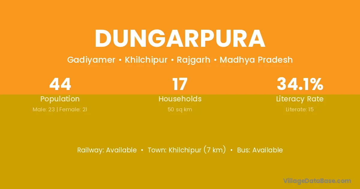 Khilchipur (7 km) is the nearest town to Dungarpura village for major economic activities and is located approximately 7 km away.