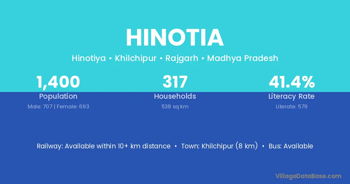Khilchipur (8 km) is the nearest town to Hinotia village for major economic activities and is located approximately 8 km away.