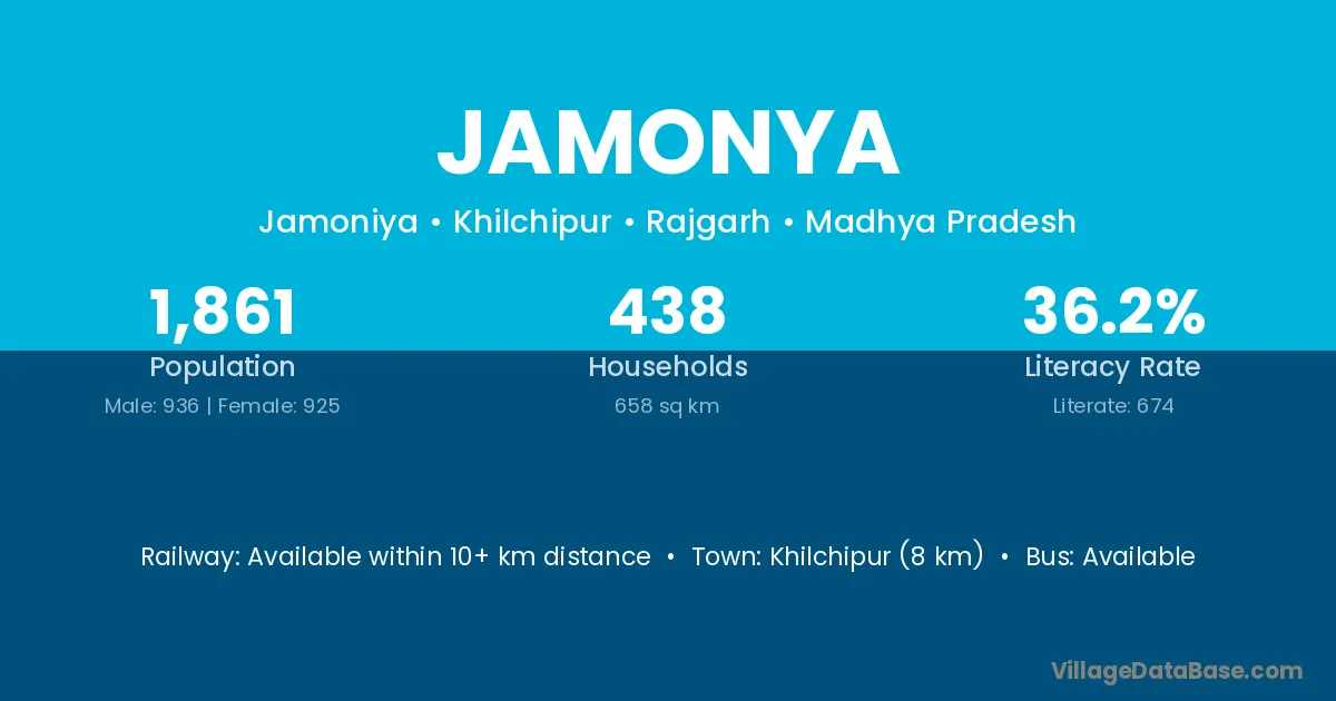 Khilchipur (8 km) is the nearest town to Jamonya village for major economic activities and is located approximately 8 km away.