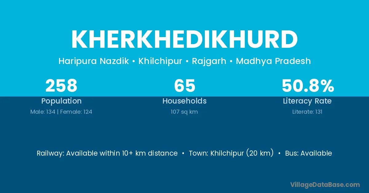 Khilchipur (20 km) is the nearest town to Kherkhedikhurd village for major economic activities and is located approximately 20 km away.