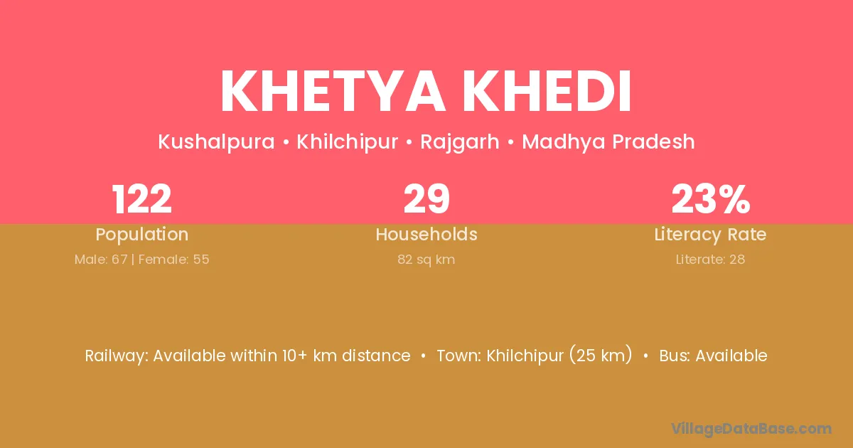 Khetya Khedi village has a total population of 122 people, of which 67 are males and 55 are females.