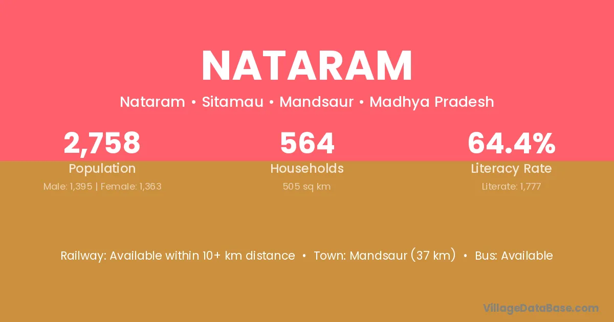 Khilchipur (18 km) is the nearest town to Nataram village for major economic activities and is located approximately 18 km away.