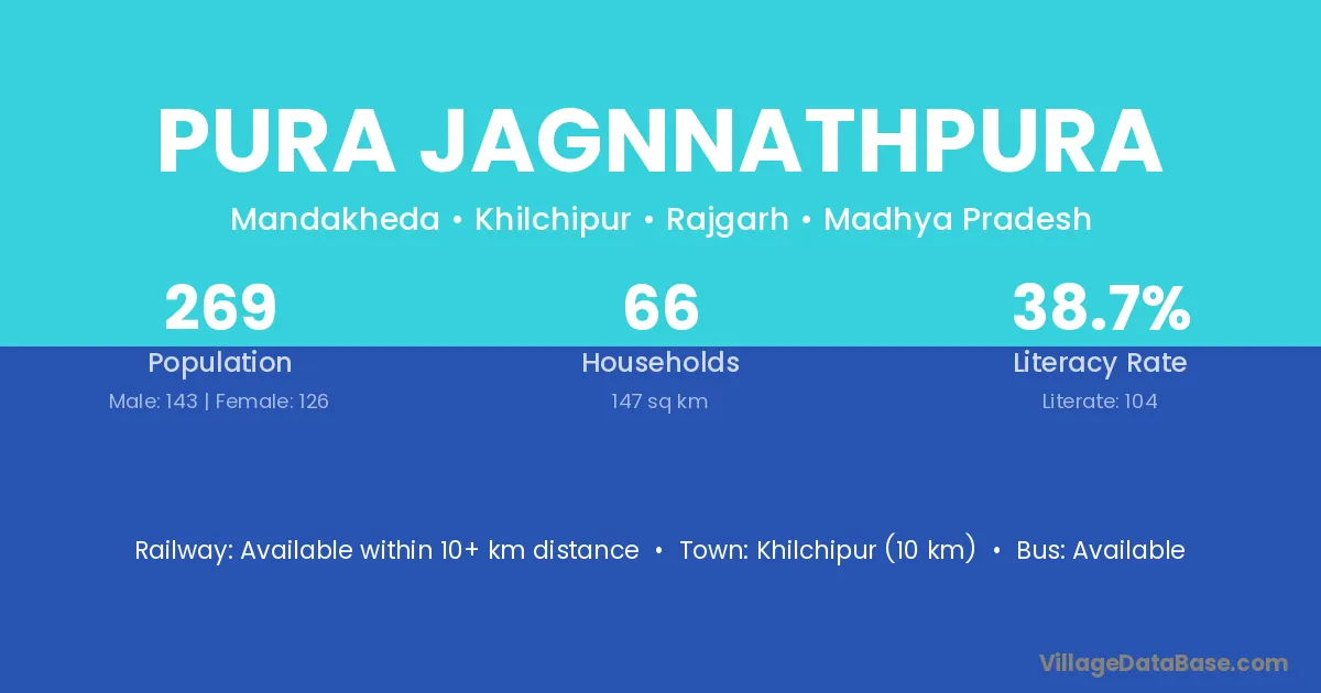 Khilchipur (10 km) is the nearest town to Pura Jagnnathpura village for major economic activities and is located approximately 10 km away.