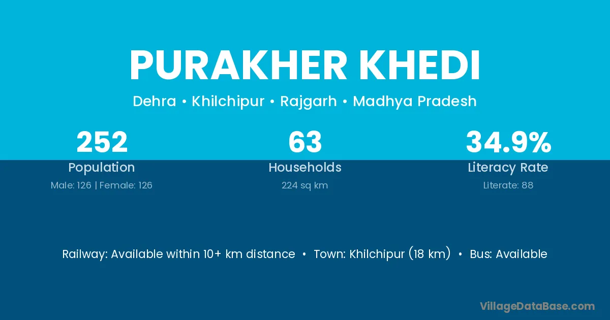 Khilchipur (18 km) is the nearest town to Purakher Khedi village for major economic activities and is located approximately 18 km away.