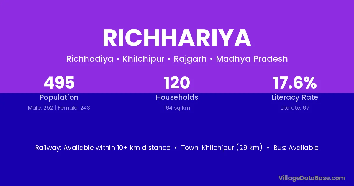 Khilchipur (29 km) is the nearest town to Richhariya village for major economic activities and is located approximately 29 km away.