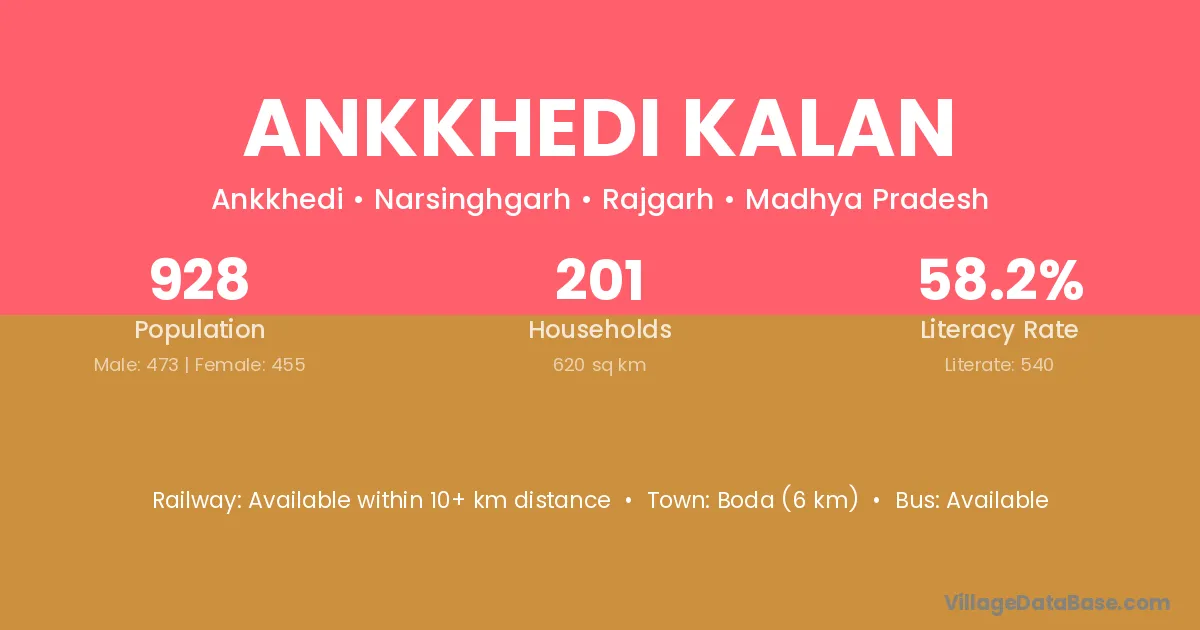 Ankkhedi Kalan village has a total population of 928 people, of which 473 are males and 455 are females.