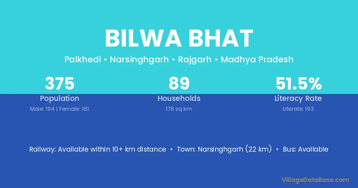 Narsinghgarh (22 km) is the nearest town to Bilwa Bhat village for major economic activities and is located approximately 22 km away.