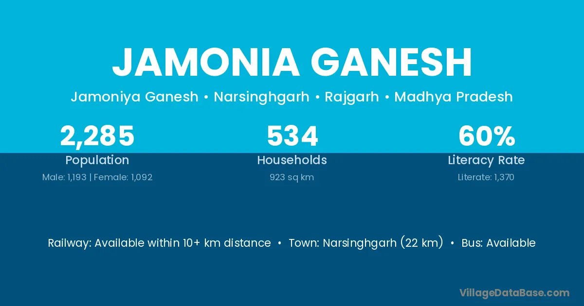 Narsinghgarh (22 km) is the nearest town to Jamonia Ganesh village for major economic activities and is located approximately 22 km away.