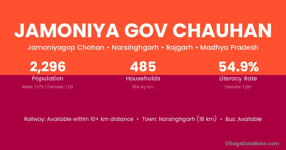 Narsinghgarh (18 km) is the nearest town to Jamoniya Gov Chauhan village for major economic activities and is located approximately 18 km away.