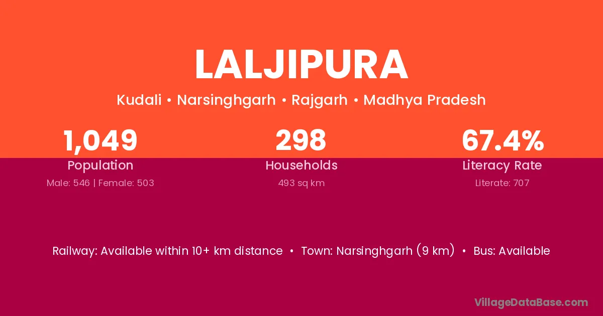 Narsinghgarh (9 km) is the nearest town to Laljipura village for major economic activities and is located approximately 9 km away.