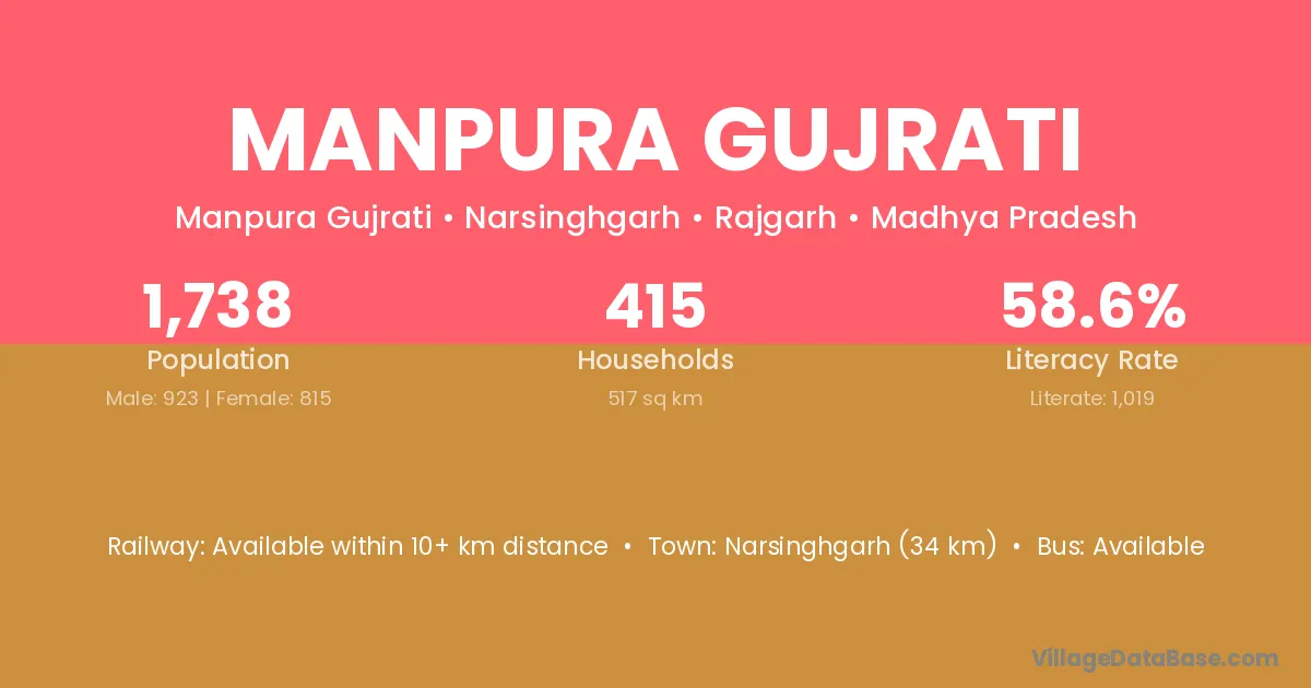 Narsinghgarh (34 km) is the nearest town to Manpura Gujrati village for major economic activities and is located approximately 34 km away.