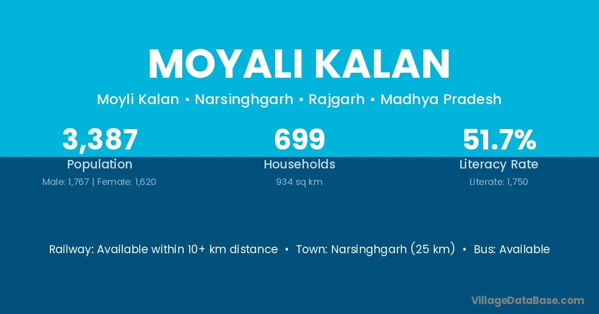 Narsinghgarh (25 km) is the nearest town to Moyali Kalan village for major economic activities and is located approximately 25 km away.
