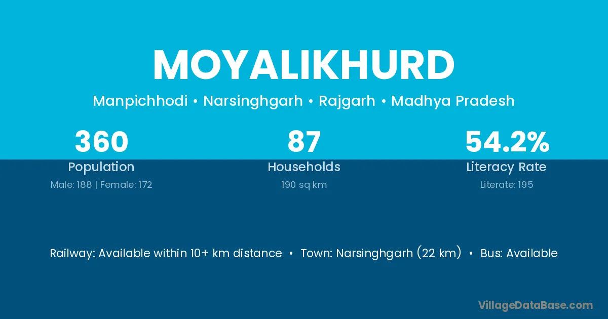 Narsinghgarh (22 km) is the nearest town to Moyalikhurd village for major economic activities and is located approximately 22 km away.